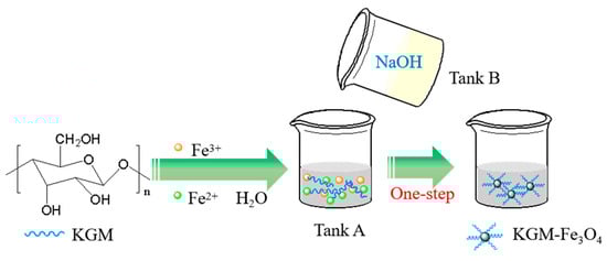 KGM-based magnetic nanoparticles (KGM-Fe3O4 NPs) were prepared through the one-step reactive precipitation between Fe3+, Fe2+ ions and NaOH using a traditional stirred tank reactor. In a typical experiment, as shown in Figure 8, FeCl3·6H2O (2.703 g), FeCl2·4H2O (1.09 g), deionized water (50 mL) and a certain mass of KGM were mixed in tank A. NaOH (2.4 g) and deionized water (50 mL) were mixed in tank B. The solution in tank B was added to tank A dropwise at 80 °C with vigorous stirring. After that, vigorous stirring was continued for 30 min. Finally, the resulting precipitation was magnetically separated, and then washed with water and ethanol to neutralize it. After freeze-drying, the final products (KGM-Fe3O4 NPs) were obtained after lyophilized for 8 h. The magnetic Fe3O4 nanoparticles without konjac glucomannan were obtained under the same experimental conditions.