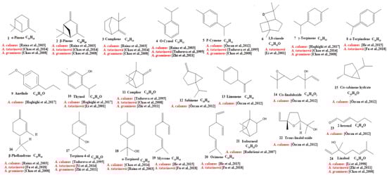 Chemical structures of monoterpenes from the Acorus genus [22,32,33,35,36,37,38,39,40,41,43].