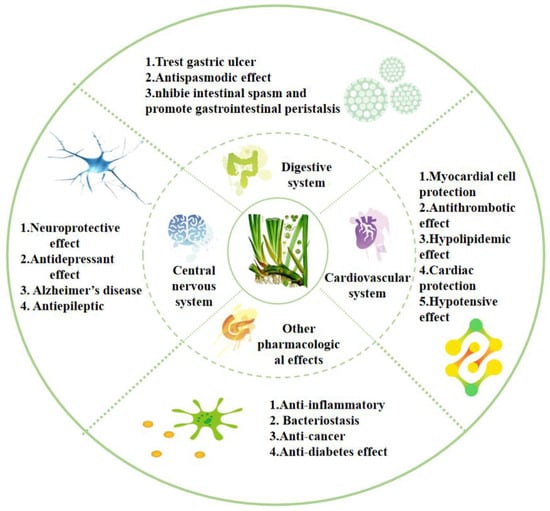 Acorus has a long medicinal history. The most commonly used parts are the rhizomes, which are widely used to treat various ailments. The whole plant, as well as leaves and inflorescences, is used in medicines [1]. Numerous in vivo and in vitro experimental studies have demonstrated that Acorus has extensive pharmacological effects (Figure 7); for example, treating diseases such as Alzheimer’s disease, depression, epilepsy, hypertension, hyperlipidemia, thrombosis, indigestion, gastric colic, and diarrhea. It also has pharmacological effects, including anti-bacterial, anti-tumor, and anti-inflammatory properties. It can be used for the treatment of multiple systemic diseases, such as those affecting the nervous system, cardiovascular system, and digestive system. Therefore, the further exploration and development of its pharmacological mechanism are of significance.