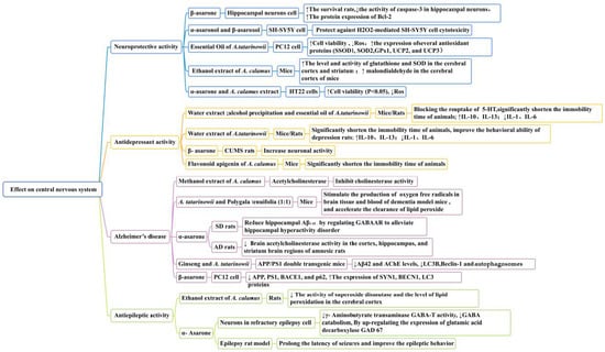 A. calamus has anti-convulsant activity. A combination of a water extract and an alcohol precipitate with carbamazepine had a stronger protective effect on the nervous system and was an effective anti-epileptic drug [164]. A. calamus has positive effects on insomnia, depression, neurasthenia, epilepsy, and amnesia. It is mainly used to treat epilepsy, fever, dizziness, wet phlegm, forgetfulness, and drowsiness. Indian herbal medicine uses it to treat various neurological and mental disorders, including epilepsy, mental disorders, memory loss, insomnia, depression, and neurasthenia [165].