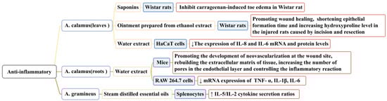 When a host is stimulated by microorganisms or other detrimental substances, inflammation occurs. Under pathological conditions, inflammation can result in tissue destruction and even organ dysfunction. Long-term inflammation impedes wound tissue reconstruction and delays healing. The activation of inflammatory cytokines and chemokines and the recruitment of macrophages can promote wound healing. In the study of the anti-inflammatory properties of Acorus, the content of wound models and inflammatory factors have also been used to prove its anti-inflammatory activity [108,109]. Researchers have mainly studied the anti-inflammatory activities of A. calamus and A. gramineus; some conclusions related to this that have been reported in the literature are shown in Figure 9. In one study, saponins (at doses of 75, 150, and 300 mg/mL) isolated from the leaves of A. calamus significantly inhibited carrageenan-induced toe edemas in Wistar rats (p < 0.01) [110].