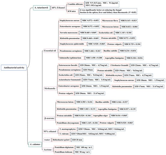 At present, domestic and foreign research on the anti-bacterial activity of Acorus plants has mainly focused on the two species of A. tatarinowii and A. calamus by measuring the IZD, MIC, MBC, and MFC. The effects of the volatile oil; ethanol, methanol, acetone extracts; and β-asarone from A. calamus on 25 common pathogenic bacteria (including Staphylococcus aureus, Staphylococcus epidermidis, Escherichia coli, Candida albicans, Helicobacter pylori, and Micrococcus luteus) have been evaluated [116,117,118,119,120,121,122]. The accurate IZD, MIC, MBC, and MFC figures are shown in Figure 10. It has been noted that there is a wide range of endophytic bacteria with anti-bacterial activity in A. calamus, accounting for 40.7% of the total number of endophytic bacteria; highly active strains account for 12.39% of the total number of endophytic bacteria. This demonstrates that there are abundant endophytic resources in A. calamus and that its metabolites have potential anti-bacterial substances. It is necessary to further study the effective ingredients of A. calamus to clarify its anti-bacterial mechanism and ensure the safety and effectiveness of the development of Acorus anti-bacterial drugs.