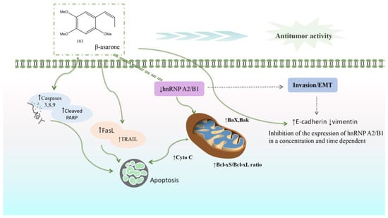 β-Asarone can increase the ratio of Bcl-xS/Bcl-xL by inhibiting the hnRNPA 2/B1 signal pathway, activating the death receptor proteins TRAIL and FasL, increasing the expression of cleaved caspases 3, 8, and 9, and inducing cell apoptosis. β-asarone can also inhibit the hnRNP A2/B1-mediated signal pathway by upregulating the expression of EMT, suggesting that it may block the epithelial–mesenchymal transformation of cancer cells.