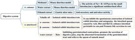 Traditional Chinese medicine believes that A. tatarinowii enters the stomach meridian and fulfills the function of dissolving dampness and harmonizing the stomach. Studies have demonstrated that it can relax the gastric smooth muscle, inhibit intestinal spasms, and promote gastrointestinal peristalsis. In one study, the total volatile oil, α-asarone, and β-asarone of A. tatarinowii were shown to inhibit the spontaneous contraction of isolated rabbit intestines and antagonize intestinal spasms caused by acetylcholine, histamine diphosphate, and BaCl2. The lowest effective concentrations were 2.0 mg/mL, 5.3 μg/mL, and 7.32 μg/mL. These ingredients also enhanced intestinal and bile secretion in rats [153]. Gastrointestinal myoelectric activity is one of the sensitive indicators used to study the form and regularity of gastrointestinal movements. Research has demonstrated that A. tatarinowii has different degrees of inhibition on the frequency and amplitude of gastric and duodenal spikes and slow waves, as well as the occurrence rate of duodenal spikes. The water extract of A. tatarinowii (4 g/kg) could significantly inhibit the slow-wave frequency (p < 0.01) and peak amplitude (p < 0.01) of gastric electricity in rats [154]. The water extract of A. tatarinowii could also promote the secretion of digestive juices, prevent the abnormal fermentation of the gastrointestinal tract, and relieve smooth muscle spasms (Figure 13) [155].
