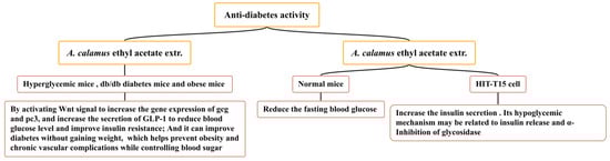 Diabetes mellitus is an endocrine and metabolic disease caused by defects in pancreatic secretion or insulin function. Based on the high acceptance of natural plant ingredients by patients, the hypoglycemic activity of natural products has become the focus of current medical research [156]. A. calamus is widely used in the traditional folk medicine of America and Merak (Banten, Indonesia) to improve diabetes. Several studies have confirmed that the ethyl acetate extract of A. calamus has an anti-diabetes effect (Figure 14), increasing the secretion of GLP-1 and inhibiting α-glycosidase activity, which can reduce blood sugar. A. calamus ethyl acetate extract (100 mg/kg) has been shown to exert a hypoglycemic effect on hyperglycemic mice (induced by STZ), db/db diabetes mice, and obese mice (induced by a high-fat diet). It may increase the gene expression of gcg and pc3 by activating the Wnt signal and reducing the blood glucose level by directly or indirectly increasing the secretion of GLP-1 [157]. The ethyl acetate extract of A. calamus has been shown to promote the differentiation of 3T3-L1 preadipocytes to a certain extent; it has also been shown to have potential insulin-sensitizing activity and release the α-glucosidase inhibition mechanism. It has a hypoglycemic role and does not increase weight, thus improving diabetes and helping to prevent obesity and chronic vascular complications whilst controlling blood sugar [158,159]. In one particular study, the ethyl acetate extract of A. calamus (400 and 800 mg/kg) significantly reduced the fasting blood glucose of normal mice and increased the insulin secretion of HIT-T15 cells. Its hypoglycemic mechanism may be related to insulin release and the α-inhibition of glycosidase [160].