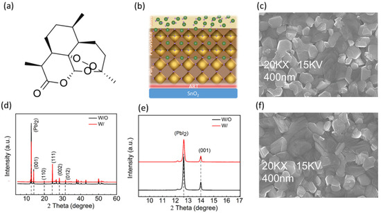 (a) Molecular structure of ART; (b) schematic of perovskite formation in two-step method; (c) top SEM of control perovskite film; (d) XRD full spectra of the control; (W/O) and ART incorporated (W/) perovskite films (e) PbI2 peaks in W/ and W/O ART perovskite; and (f) top SEM of ART-based perovskite film.