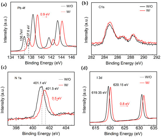 XPS spectra of the control group and experimental group: (a–d) peak position change charts for Pb4f, C1s, N1s, and I3d.