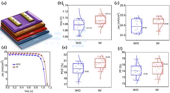The final device structure is schematically presented in Figure 4a, and the JV curves of the best devices for both W/ and W/O are shown in Figure 4b. The maximum efficiency of the perovskite solar cells increased from 20.21% for the devices without the ART layer, with a Jsc of 24.86 mA/cm2, Voc of 1.07 V, and an FF of 0.76, to 21.72% for the devices with the ART layer, with a Jsc of 24.69 mA/cm2, Voc of 1.11 V, and an FF of 79.52 (Champion devices’ photovoltaic parameters for both types are included in Table S3). We investigated the performance reproducibility of the ART-based PSCs by assessing the photovoltaic parameters of 30 devices for each type (W and W/O ART). The photovoltaic parameters (Jsc, Voc, FF, and PCE) are evaluated, as shown in Figure 4b,c,e,f. Remarkably, all of the photovoltaic parameters improved after the inclusion of the ART layer. The calculated average Voc, Jsc, FF, and PCE values in the W/O ART devices were 1.07 V, 24.46 mA/cm2, 74.08, and 19.62%, respectively. On the contrary, in the W/ ART devices, the average values of Voc, Jsc, FF, and PCE were 1.09 V, 24.69 mA/cm2, 75.10, and 20.51%, respectively. In addition, the hysteresis index (HI) was determined to quantify the efficiency mismatch using the equation: HI = (PCEreverse − PCEforward)/PCEreverse. The HI decreased from 0.64% for the devices without the ART layer to 0.41% for the devices with the ART layer interface modification (Table S3), indicating a reduction in the defects and hysteresis effect. These results demonstrate that the ART passivation layer significantly improves the performance and stability of perovskite solar cells.