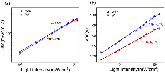 (a) The function relationship between (a) Jsc and (b) Voc with incident light intensity for W/O and W/ ART device.