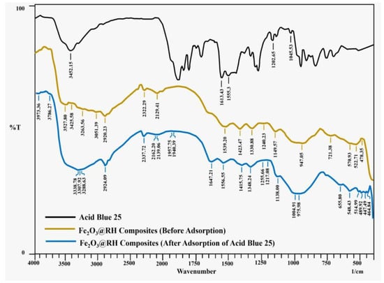 FTIR spectra of Acid Blue 25 and Fe2O3@RH composites (before and after adsorption).