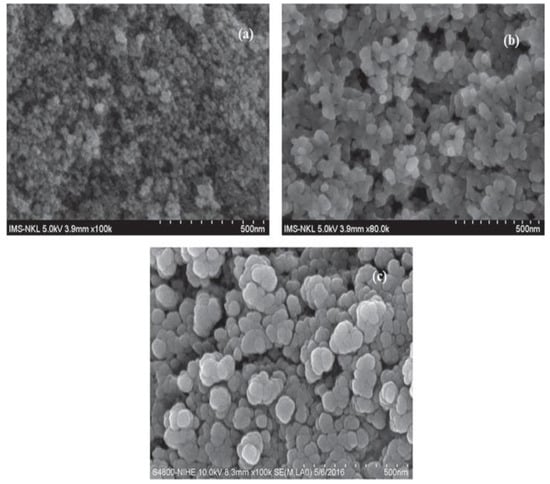 SEM of Fe2O3@RH composites at 500 nm resolution (taken at three different angles, (a) (3.9 mm × 100), (b) (3.9 mm × 80 and (c) (8.3 mm × 100).