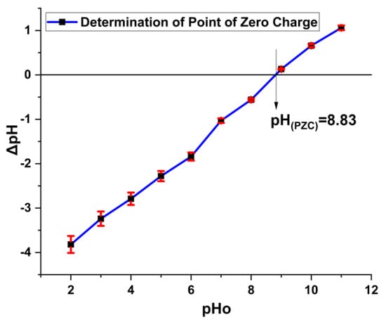 In this context, “pH” denotes the final pH value, while “pHo” represents the initial pH value. The juncture where these two values coincide on the x-axis marks the point of intersection, which indicates the point of zero charge (PZC) for the Fe2O3@RH composites [40,41].