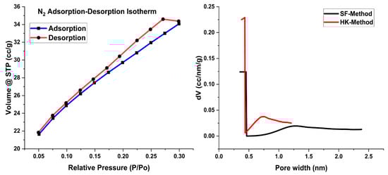 Similarly, the SF method, which is considered suitable for solid materials, was also used to determine the surface properties of the adsorbent. Parameters calculated by this method were also found to be in good agreement with the HK method. The porosity of the adsorbent as determined by these two methods is an indicator of small surface pores available on the surface of the Fe2O3@RH composites.