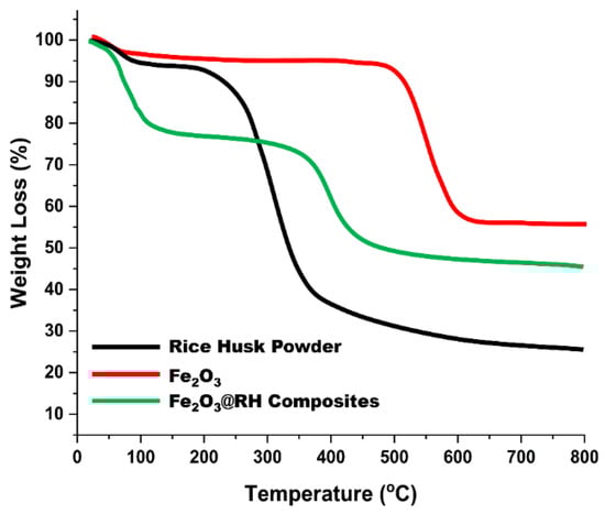 Thermogravimetric analysis of the raw rice husk, Fe2O3 nanoparticles, and Fe2O3@RH composites was performed to observe the behavior of these compounds towards variable heating rates. As shown in Figure 5, raw rice husk shows gradual weight loss from room temperature to 150 °C due to the moisture content and volatile content present in it. Major weight loss occurs at 210 °C, which can be attributed to major pyrolysis of rice husk, which results in main weight loss. For Fe2O3 nanoparticles, a slight change in weight is observed initially due to moisture content. Major changes in weight occur at 505 °C due to phase transition in synthetic nanomaterials. Fe2O3 changes to FeO above 500 °C in the second step of the thermogravimetric curve. In the case of Fe2O3@RH composites, the TGA curve shows weight loss due to moisture contents present in it at 106 °C. Major weight loss occurs at 360 °C due to decomposition of the composites. Due to the loading of Fe2O3 nanoparticles, the pyrolysis path of the rice husk changes and shifts to high temperature. At this stage, composites break down into their components, and pyrolysis of rice husk takes place [21,22].