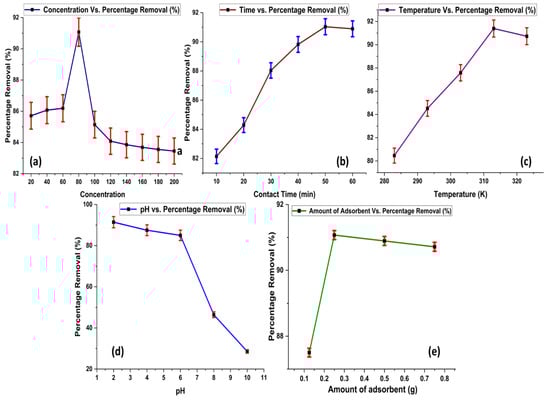 An adsorption experiment was performed at variable initial concentration, contact time, temperature, pH, and amount of adsorbent, as shown in Figure 6.