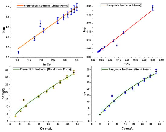 Results of kinetic models are summarized in Table 4, which indicates the successful application of the pseudo-first-order kinetic model on the experimental results, with a high R2 value (0.9 for linear and 0.99 for nonlinear form). According to the pseudo-first-order kinetic model, rate of adsorption is related to adsorption sites freely available on the surface of the adsorbent. As these sites become occupied, the adsorption rate also falls. A similar trend is observed in the present study: adsorption increases with the increase in contact time initially, but after maximum adsorption, no significant role is played in terms of adsorption rate by increasing time. A similar trend is also reported in the literature by other researchers [25].