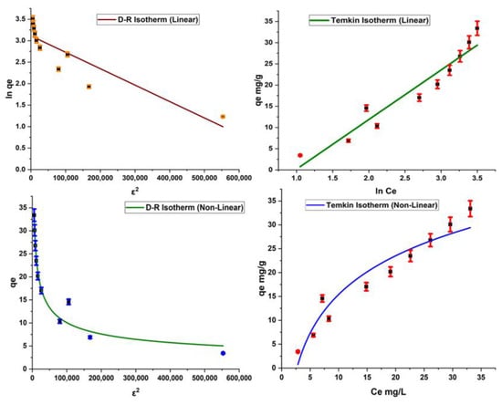 The Temkin isotherm is based on the assumption that the heat of the reaction changes during the adsorption phenomenon (Figure 8). The Temkin constant KT contributes information about binding energy in the adsorption process, and the constant BT provides information about the heat of adsorption [27]. Results indicate that BT > 0, which expresses the exothermic nature of the adsorption process, as given in Table 3.