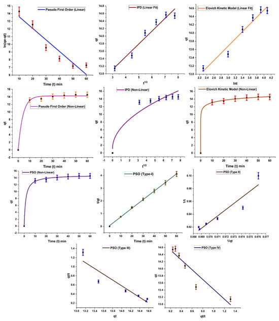The time required for a particular adsorption process and the uptake level of the adsorption phenomenon are described by adsorption kinetics. Several kinetic models are available in this regard, as given in Table S3.
