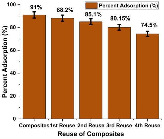 Solid waste generated after the adsorption process is another serious threat to the environment. Its proper disposal is quite difficult as it carries harmful dyes on it. In this regard, different efforts are made by scientists to regenerate adsorbent and make it less harmful to the environment [30,31]. In the present work, after the adsorption phenomenon, the adsorbent was regenerated by treating it with ethanol for 1 h. Dye was desorbed, and after filtration and drying, adsorbent was again applied for the removal of dye. Initially, composites showed 91% dye removal efficiency. After four regeneration cycles, adsorption efficiency gradually decreased to 74.5%, as shown in Figure 10. Synthetic composites were found to be quite stable and efficient after several reuses. This property of composites makes them an excellent choice for water decontamination.