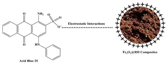Point of zero charge bears an important place in adsorption study as pH is one of the governing factors for the adsorption of dye on the surface of the composites. During adsorption, electrostatic forces play an important role for adsorbing dye along with other interactive methods. In instances where the pH of an aqueous solution falls below the point of zero charge (PZC) [pH < pH(PZC)], the surface of the Fe2O3@RH composites adopts a positive charge. In scenarios where the pH of the aqueous solution corresponds to the point of zero charge (PZC) [pH = pH(PZC)], the surface of the Fe2O3@RH composites maintains an electrically neutral state. Conversely, when the pH of the aqueous solution surpasses the point of zero charge (PZC) [pH > pH(PZC)], the surface of the Fe2O3@RH composites attains a negative charge. Acid Blue 25 bears negative charge in solution, so it needs a positive surface for attachment. In this regard, dye adsorption is favorable at low pH value where composites carry positive charge on the surface (Figure 3).