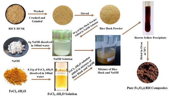 For the synthesis of Fe2O3@RH composites, 6 g of NaOH was dissolved in 100 mL of water and added to 10 g of finely divided powder of rice husk in a 250 mL beaker. In another flask, 8.11 g FeCl3.6H2O was dissolved in 100 mL of water, and the solution was heated to 70 °C to make it hot. The mixture of rice husk and NaOH was heated at 70 °C followed by the slow addition of a hot solution of FeCl3.6H2O. The slurry was mixed by constant stirring and aerated for 1 h until a brown–yellow color solution appeared. The product was dried in a drying oven at 70 °C for 12 h. The dried product was washed with water to remove excess NaOH, and a pure product was obtained. This final product was dried again for 2 days to remove the moisture. The final product obtained was pure Fe2O3@RH composites (Figure 12).