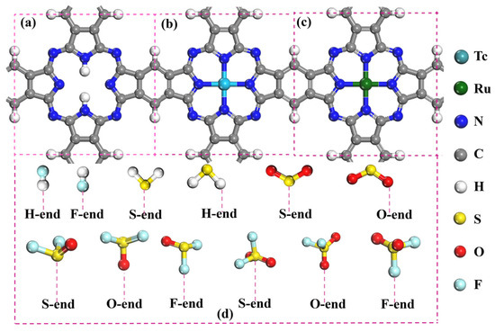 In the TMPc (TM = Tc and Ru) monolayer, as displayed in Figure 1b,c, the Tc/Ru atom is surrounded by four nearest-neighbor N atoms (N4) in the center vacancy, and the suspended bonds of C atoms are passivated with the H atoms. Moreover, all atoms in the three optimized geometric structures are coplanar. According to our previous investigation [47,48], the hollow site of the H2Pc and TMPc monolayer is the preferential adsorption site for the “porphyrin-like” configurations. When the SF6 decomposition components approach the H2Pc/TMPc monolayers, various adsorption styles of SF6 decomposition gases are considered, as shown in Figure 1d. For instance, two different adsorption configurations of HF on the H2Pc/TMPc monolayers are considered: HF adsorption on the substrate with the H atom orients towards the surface (defined as the H-end) and HF adsorption on the substrate with the F atom orients towards the surface (defined as the F-end).