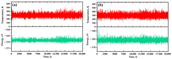 Figure 2 illustrates that the binding energy (Ebin) of RuPc is smaller than the cohesive energy (Ecoh) of bulk Ru, indicating robust thermal stability in the RuPc monolayer [47]. Despite TcPc having a larger Ebin than the Ecoh of bulk Tc, the negative value of the binding energy is sufficient to maintain the structural stability of the TcPc monolayer [48]. The high stability of both the RuPc and TcPc monolayers is further supported by an ab initio molecular dynamics (AIMD) simulation, as depicted in Figure 3. Here, the temperature and potential energy of TcPc and RuPc exhibit only slight fluctuations around the equilibrium state after heating at 300 K for 20 ps with a time step of 1 fs. Therefore, both the TcPc and RuPc monolayers exhibit sufficient stability for application as sensing materials.