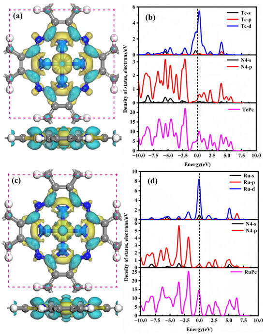 CDD and DOSs of the (a,b) TcPc and (c,d) RuPc monolayer. The four nearest-neighbor N atoms of TcPc/RuPc monolayer are indicated by N4. The cyan and yellow areas correspond to the charge accumulation and consumption, respectively. The isosurface of CDD is set as ±0.01 eÅ−3, and the black dashed line is the Fermi level.