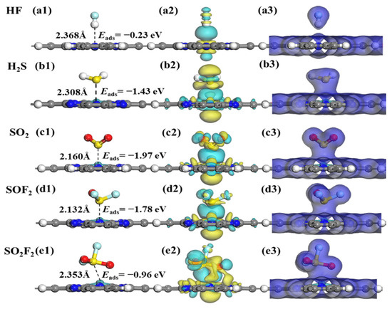 Figure 9 illustrates the lowest energy structures, CDD, and EDD of the SF6 decomposition gas adsorbed on the RuPc monolayer. As displayed in Figure 9a1–d1, a clear trend can be observed in the adsorption energies (Eads), as follows: Eads (HF) > Eads (SO2F2) > Eads (H2S) > Eads (SOF2) > Eads (SO2). In general, adsorption processes with Eads greater than 0.8 eV are commonly classified as chemisorption [52], and the adsorption energies of H2S, SO2, and SOF2 molecules on the RuPc monolayer are −1.26 eV, −1.64 eV, and −1.53 eV, respectively. Obviously, the RuPc monolayer exhibits appropriate adsorption strength to chemically capture H2S, SO2, and SOF2 gas molecules. In contrast, the interaction between HF, SO2F2 molecules, and the RuPc monolayer is weak. The adsorption energies of HF and SO2F2 are −0.28 eV and −0.33 eV, with corresponding adsorption distances of 2.268 Å and 3.411 Å, respectively. This outcome indicates that HF and SO2F2 weakly adsorb onto the RuPc monolayer, primarily driven by van der Waals forces. The CDD plots in Figure 9a2–e2 demonstrate electron transfer occurring between H2S, SO2, SOF2, and the RuPc nanosheet. From Figure 9a2 and e2, the presence of large electron depletion between HF/SO2F2 and RuPc also demonstrates their weak interaction. However, abundant electrons of H2S/SO2/SOF2 are transferred to the intermediate region of the gas–substrate, resulting in a strong interaction between H2S/SO2/SOF2 and the RuPc monolayer. In addition, HF, SO2, and SOF2 acquire a few electrons from the RuPc monolayer, acting as electron acceptors. Conversely, the other gas molecules function as electron donors, releasing a portion of their electrons. This observation aligns well with the results obtained from Hirshfeld charge analysis (Table 3). As shown in Figure 9a3–e3, there exists a significant electron overlap between H2S, SO2, and SOF2 molecules and the RuPc monolayer, while electron overlap does not occur in the HF@RuPc and SO2F2@RuPc systems. Consequently, it is concluded that the RuPc monolayer has a strong capture ability in terms of H2S, SO2, and SOF2 molecules.