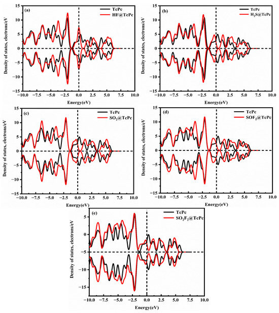 DOSs of different gas@TcPc adsorption systems. (a) HF@TcPc, (b) H2S@TcPc, (c) SO2@TcPc, (d) SOF2@TcPc, and (e) SO2F2@TcPc. The black and red lines represent the DOSs of the TcPc monolayer before and after gas adsorption, respectively. The Fermi level serves as the zero-energy reference point and is represented by a vertical black dashed line.