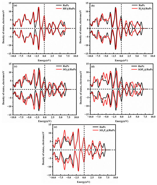 DOSs of different gas@RuPc adsorption systems. (a) HF@RuPc, (b) H2S@RuPc, (c) SO2@RuPc, (d) SOF2@RuPc, and (e) SO2F2@RuPc. The black and red lines represent the DOSs of the RuPc monolayer before and after gas adsorption, respectively. The Fermi level serves as the zero-energy reference point and is represented by a vertical black dashed line.