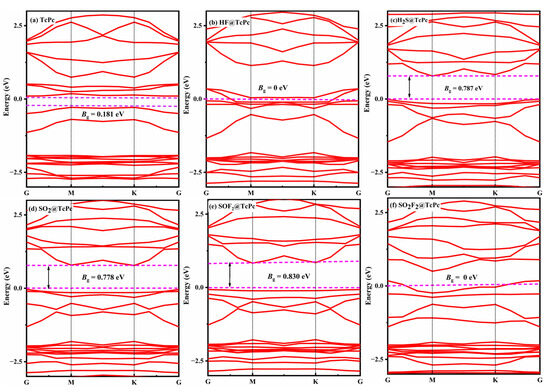 Band structure of various adsorption systems. (a) TcPc, (b) HF@TcPc, (c) H2S@TcPc, (d) SO2@TcPc, (e) SOF2@TcPc, and (f) SO2F2@TcPc. The Fermi energy is set as zero, and the space between the dashed colored lines represents the bandgap.