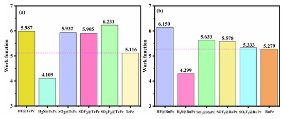 Work function of (a) TcPc and (b) RuPc monolayers with and without SF6-decomposed gas adsorption. The dashed colored lines represent the work function values of pristine TcPc and RuPc monolayer, respectively.