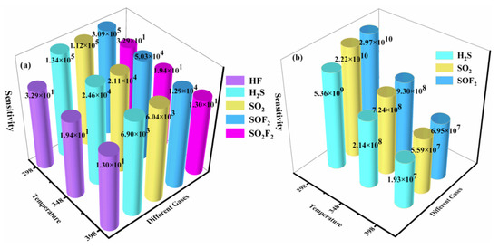 where σTMPc/gas and σTMPc are the electrical conductivity of TMPc monolayer after and before adsorption, respectively. Figure 15 gives the sensitivity of five gas molecules on the TcPc and RuPc monolayers. As shown in Figure 15a, the sensitivity of the TcPc monolayer towards each gas gradually decreases as the temperature ranges from 298 K to 398 K, which is consistent with the sensitivity of the Rh-doped h-BN monolayer to SF6 decomposition gas [55]. Moreover, the TcPc monolayer exhibits the highest sensitivity to SOF2 at each temperature, followed by H2S, SO2, and SO2F2. Correspondingly, the TcPc monolayer exhibits outstanding sensitivity in detecting SO2, H2S, and SOF2 at its operating temperature. As illustrated in Figure 15b, it is evident that RuPc’s sensitivity to SF6 decomposition byproducts (H2S, SO2, and SOF2) at room temperature falls within the range of (5.36~29.7) × 109, significantly exceeding the sensitivity towards SF6 alone (approximately 103), and there is a slight decrease in sensitivity as the operating temperature rises. However, the sensitivity of H2S, SO2, and SOF2 at high temperature (398 K) is determined to be within the range of (1.93~6.95) × 107, surpassing the sensitivity of Rh-BN towards SF6-decomposing species [55]. The exceptional sensitivity of the RuPc monolayer enables it to possess the precise ability to detect SF6 decomposition gases, underlining its potential for gas-sensing applications. In summary, both TcPc and RuPc monolayers exhibit remarkable capability in detecting these SF6-decomposing species.