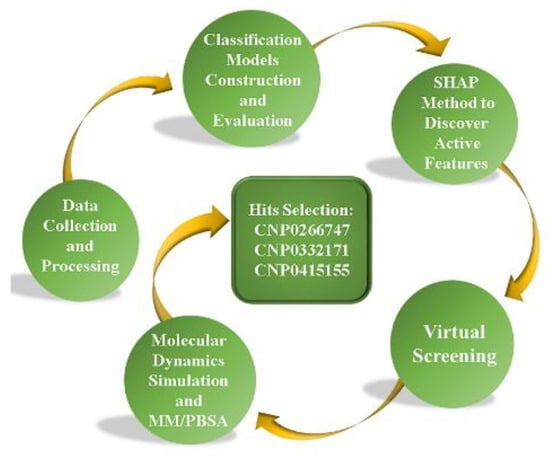 Herein, we introduce a general pipeline that integrates machine learning methods, the interpretable model SHapley Additive exPlanation (SHAP) [], and molecular dynamics simulations for discovering potential dual inhibitors (Figure 1). We applied this pipeline to the discovery of potential dual inhibitors of BTK and JAK3 from a natural product database (the Coconut database is a generalized natural product database which has been consolidated from 53 different databases and the literature). The machine learning models were built using random forests (RFs), extra trees (ETs), and extreme gradient boosting (XGB) and validated for prediction of inhibitor activities. Later, we applied these three models to predict active compounds from the natural products to discover potential dual inhibitors of BTK and JAK3. We used the interpretable model SHAP to interpret the effect of individual active molecular fingerprint features on outcome prediction. Next, three compounds against BTK and JAK3 were identified via molecular dynamics and binding free energy. These compounds have potential to serve as dual-target inhibitors against BTK and JAK3. Finally, we selected the optimal compound CNP0266747 among the screened compounds as the most promising potential inhibitor.