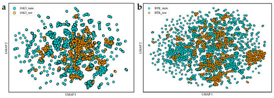 Diversity distribution of the modeling data. (a,b) Two-dimensional spatial distribution maps of BTK and JAK3, respectively.