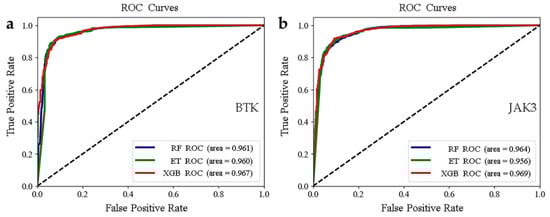 (a,b) Plots of ROC curves for the BTK and JAK3 test sets.