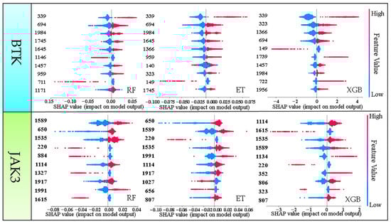 JAK3: The top 10 Shapley values of the fingerprint fragments are shown in Figure 4. Only the fingerprint fragments 1589, 1535, and 1114 appeared in the top 10 Shapley values of all three models (Table 3) and were the focus objects, especially 1589, which had the highest value of the three fingerprints. These findings not only provide an insight into the impact of fingerprint features on the model but also serve as the foundation for fragment-based drug design.