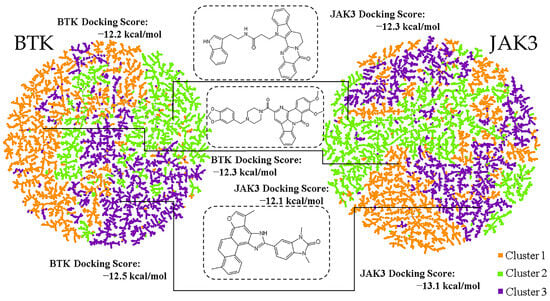 AutoDock Vina was employed for executive molecular docking of BTK (PDB ID: 8FLL) and JAK3 (PDB ID: 6AAK) with the Coconut database filtered via machine learning models, respectively []. The docking box center was located at the small molecule of the inhibitor in the crystal structure, and the box size was set to 20 Å × 20 Å × 20 Å. Before docking, Jackal software was used to complete the missing protein residues and atoms and to add polar hydrogen for protein pretreatment. After docking, the compounds were clustered into three categories using the Kmeans classification method [].