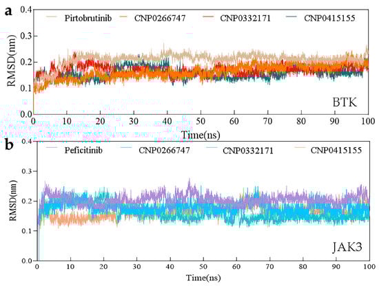 The changes in RMSD with time in the simulation. (a) RMSD values of BTK complex systems. (b) RMSD values of JAK3 complex systems.