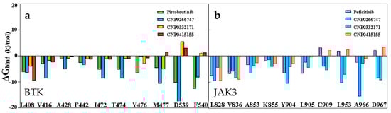 (a) Decomposition of the active site residues for binding free energy BTK complex systems. (b) Decomposition of the active site residues for binding free energy JAK3 complex systems.