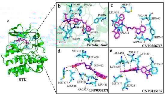 Considering BTK, all interactions of the screened compound complexes at the active sites were consistent with those observed for the BTK–pirtobrutinib complex. H-bonds or hydrophobic interactions were found between the compounds and the hinge region, which provided them with stability in the active pocket (Figure 8a,b). The compound CNP0266747 formed one H-bond with Asp539 and six hydrophobic interactions with residues Leu408, Val416, Val458, Met477, Leu460, and Phe540 (Figure 8c). The residue Met477 located in the hinge region formed a hydrophobic interaction with the compound, while residues Asp539 and Phe540 from the DFG motif domain formed an H-bond and a hydrophobic interaction, respectively. MD simulation revealed the persistent presence of an H-bond with Asp539 (Table A1). The compound CNP0332171 formed three H-bonds with residues Gln412, Met477, and Cys481 and six hydrophobic interactions with residues Leu408, Val416, Leu483, Arg525, and Leu528 (Figure 8d). The compound CNP04151447 formed hydrophobic interactions with residues Leu408, Phe413, dal416, Ala428, Lys430, Met477, and Leu528. One pi–pi stacking interaction was formed between the benzene group of the compound and the residue Phe413 (Figure 8e). All these compounds can form sustained hydrogen bonds or hydrophobic interactions with the key residue Met477. Noteworthy, only the compound CNP0266747 formed interactions with the residues Asp539 and Phe540. This difference may be responsible for the different trends in the contribution of the residues to the binding free energy.
