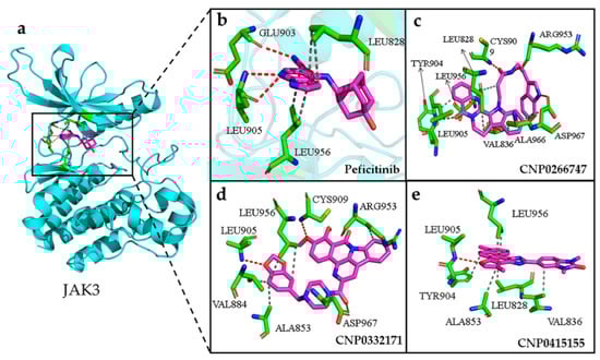 (a) The conformation of peficitinib (shown in violet color and stick model) inside the active pocket of JAK3 (shown in cyan color and cartoon model). (b) Peficitinib, (c) CNP0266747, (d) CNP0332171, (e) CNP0415155 inside the active site of target protein. The compounds are shown as violet-colored sticks and the active residues are shown as green sticks. Hydrogen and hydrophobic bonds are formed between proteins and the compounds are shown as red and gray dotted lines, respectively.