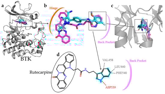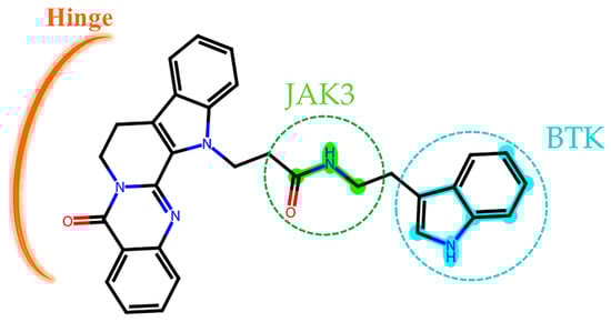 In the 20th century, the doctrine “one molecule, one target, one disease” served as a guiding principle for the pharmaceutical industry. However, this paradigm was recognized to be unsatisfactory for therapeutic effects of multifactorial diseases such as tumors and immune system diseases [,]. Therefore, it is crucial to discover drugs that simultaneously manipulate multiple targets and interrupt the pathogenesis process of multifactorial diseases []. Studies have highlighted the overexpression of kinases in many cancers [], and different kinase inhibitors have gained popularity as potential antitumor agents []. However, concerns of drug resistance and off-targeting toxicity are yet unaddressed [,], and multitarget drugs that can overcome these limitations are warranted. For instance, Bruton’s tyrosine kinase (BTK) and Janus kinase 3 (JAK3) are two validated and therapeutically amenable targets to effectively treat B-cell lymphomas and can be used to develop a dual-target inhibitor []. As with most kinases, BTK and JAK3 share similar structures in the binding pocket, including the hinge (connecting C-terminal and N-terminal), glycine-rich loop (GRL), αC helix, and highly conserved DEG motif (Figure A1a) [,].