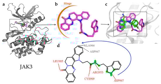 (a–c) The superimposition of the JAK3-peficitinib and JAK3-CNP0226747 complexes. The protein is shown as gray cartoon. Green-colored sticks represent pirtobrutinib and violet-colored sticks represent compound CNP0226747. (d) Hydrogen and hydrophilic bonds are formed between protein and the two-dimensional structure of the compound CNP0226747. Hydrogen and hydrophilic bonds are shown as red and gray dotted lines, respectively. The key molecular fingerprint fragment is shown as green highlight.