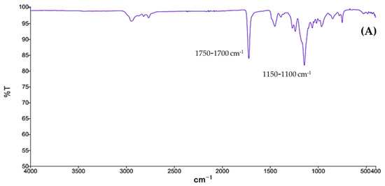 The analysis of the Eudragit® EPO polymer, NP-w/o, free EOs, and NC-EOs of R. officinalis or L. dentata was performed by IR-FT spectroscopy. The polymer and free EOs were analyzed directly, while films were obtained for the NC-EOs. The analyses of the possible molecular interactions were performed with 30 scans in the 4000 to 500 cm−1 range with an IR-FT Optical Frontier Optical Spectrophotometer (PerkinElmer, Waltham, MA, USA).
