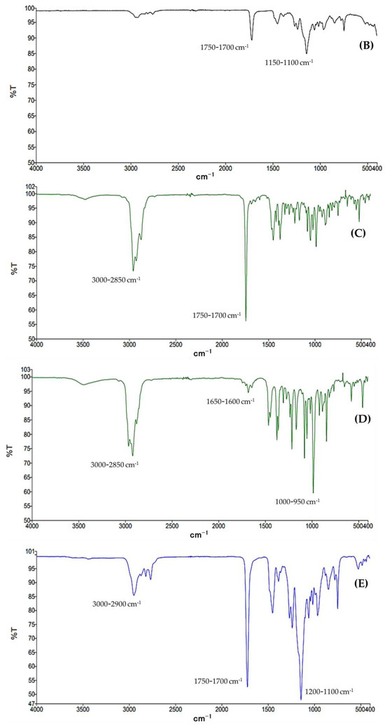 The polymer Eudragit® EPO, NP-w/o, free EOs, and NC-EOs were characterized using FT-IR spectroscopy to investigate the interaction between the components of the NCs. The obtained FT-IR spectra for the polymer Eudragit® EPO and NP-w/o are shown in Figure 1A and Figure 1B, respectively. The ν C=O of the carboxylic acid groups was at 1750–1700 cm−1 and the ν C-O of the saturated aliphatic esters was at 1150–1100 cm−1. The spectra of free EO-R. officinalis are shown in Figure 1C, with the observed ν C=O for the O-related functional groups at 1750–1700 cm−1. Meanwhile, in Figure 1D, for EO-L. dentata, it can be observed that the ν C=C of the linear alkenes was at 1650–1600 cm−1, and at the fingerprint region, the p C-H can be found at 1000–950 cm−1. In the case of both EOs, the main bands associated with the aliphatic structures were located at 2850 cm−1 and 2950 cm−1 for the aliphatic ν and νas C–H, respectively. Figure 1E,F represent the characteristic bands of the functional groups present in the polymer (1750–1700 cm−1 and 1150–1100 cm−1) of NC-R. officinalis and NC-L. dentata, respectively.