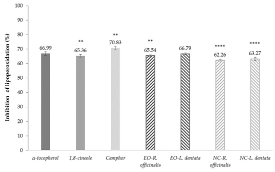 Percentage of inhibition of lipoperoxidation of controls (45 µg/mL) at 30 h of incubation time (mean ± SD, n = 3). * Indicates significant differences, ** p < 0.01, **** p < 0.0001, compared to α-tocopherol control.