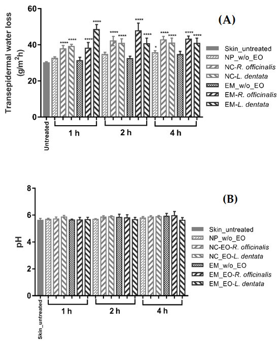 Biophysical parameters, such as the TEWL, water content, SC thickness, and pH, are the most frequently quantified parameters for assessing skin barrier function. These non-invasive evaluations are necessary to determine the effects of EOs and nanoformulations on the healthy skin barrier as an indicator of the biosafety of dermatological formulations [43]. The determination of the TEWL, pH, and SCWC using bioengineering techniques allows for the evaluation of the effects of EOs and nanoformulations on the biophysical parameters of the skin. In this sense, for the ex vivo evaluation of the effect of free EOs, emulsions (EM-EOs) were prepared. TEWL can be an effective marker of the function, efficiency, or integrity of the skin barrier and is commonly used as a good technique to assess structural alterations in the skin [44]. Figure 3A shows the effect of topical formulations without EOs (NP w/o-EO and EM w/o-EO) after contact with the skin surface for 1, 2, and 4 h. The TEWL did not show significant differences with respect to the untreated skin. In contrast, the NC-EO and EM-EO formulations showed a significant increase in the TEWL (p < 0.0001) compared to the untreated skin. This behavior has been previously reported, where the terpenes present in EOs interact with intercellular lipids, temporarily altering the reorganization of the “brick–mortar” structure of the SC, favoring the diffusion of water to the SC, and increasing the TEWL values, a reversible condition [45,46]. Regarding the evaluation of the pH, the acid character of the skin (pH between 4.5 and 6) is due to the so-called “acid mantle”, capable of inhibiting the growth of bacteria and maintaining the optimal acidic environment for the skin’s natural flora to thrive, thus maintaining the skin’s pH and ensuring that the acid mantle remains intact [47]. Figure 3B shows that no topical formulation presented significant differences (ns) after contact with the skin surface for 1, 2, and 4 h. This is because the formulations had pH values close to the pH range of the skin surface; thus, the contact of EOs formulations (EM-NCs) did not cause changes in the pH of the skin, that is, the acid mantle remained functional without altering the homeostasis of the skin.