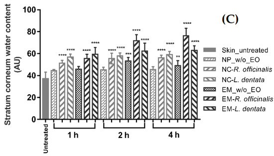 In contrast, in relation to the SCWC, skin hydration is determined by exogenous factors, such as the temperature and relative humidity, as well as by endogenous factors, such as the natural hydration factor (FNH), formed mainly by the degradation of keratinocytes and the constituents of sweating, components capable of capturing water from the atmosphere [48]. Variations in the hydration of the SC generate changes in the dielectric constant of the skin, which is measured as a change in capacitance. Figure 3C shows the SCWC after contact with topical formulations with the skin surface for 1, 2, and 4 h. The SCWC shows significant differences (p < 0.0001) compared to the untreated skin; this could be because the formulations are in an aqueous medium (o/w), and when the skin is exposed to a humid environment, the FNH is capable of absorbing amounts of water that increase the SCWC. The physicochemical characteristics of NC-EOs, such as a size >200 nm and a positive zeta potential, favor their mechanical interaction and deposition in the SC, mainly in hair follicles and skin folds, which ensures greater interaction with the SC and increases water uptake.